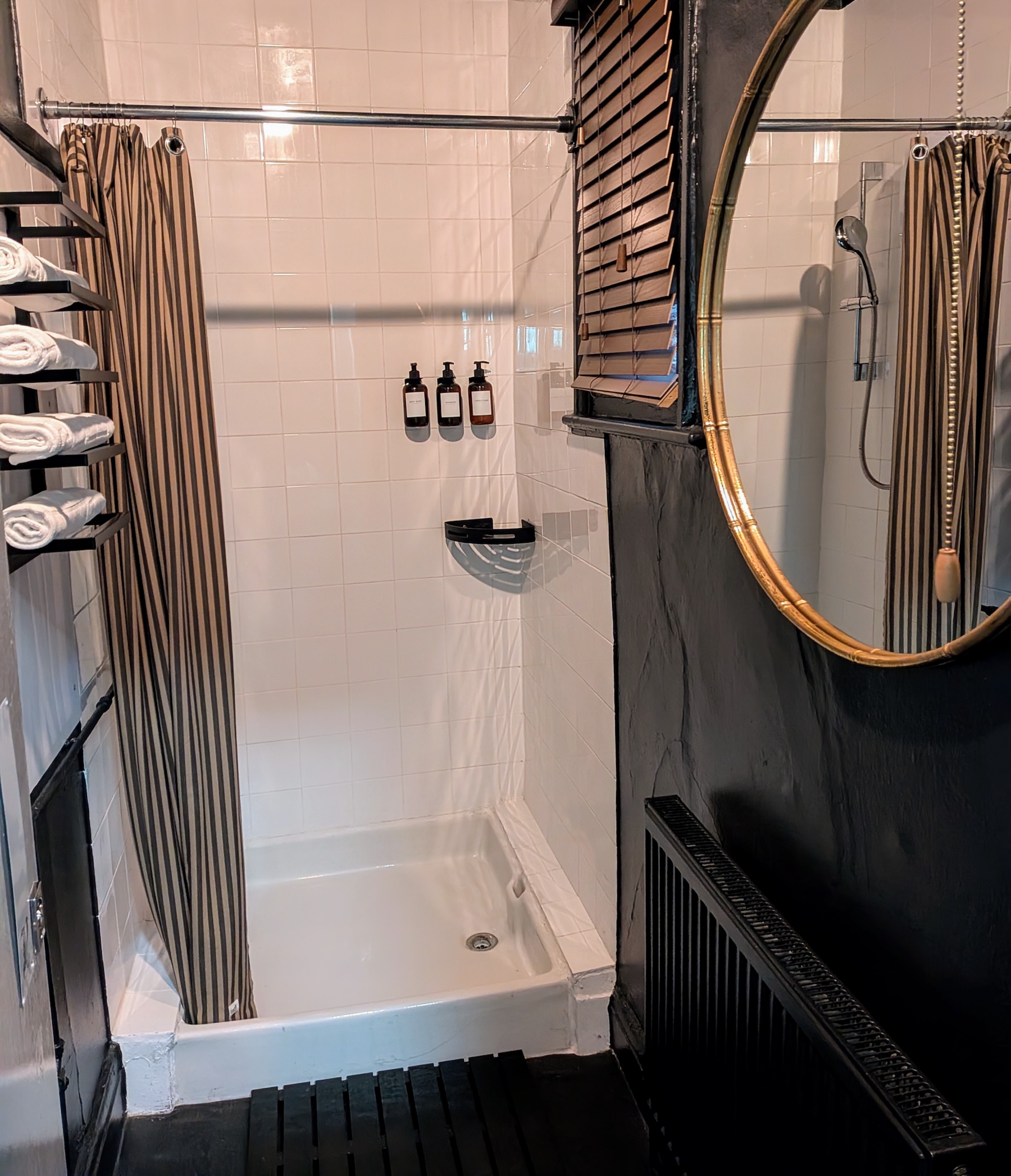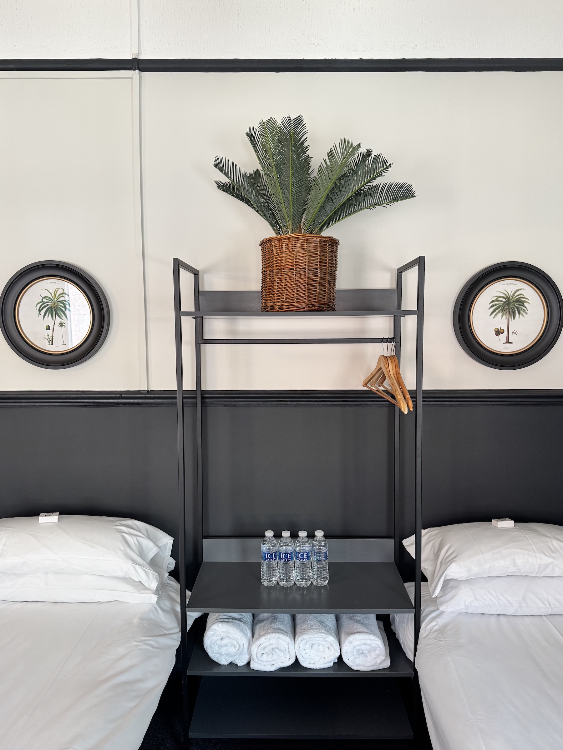 The Boutique Hostel: Upstairs is bright, stylish, and surprisingly spacious — clean modern lines, leafy touches, and a relaxed, travel-friendly feel.